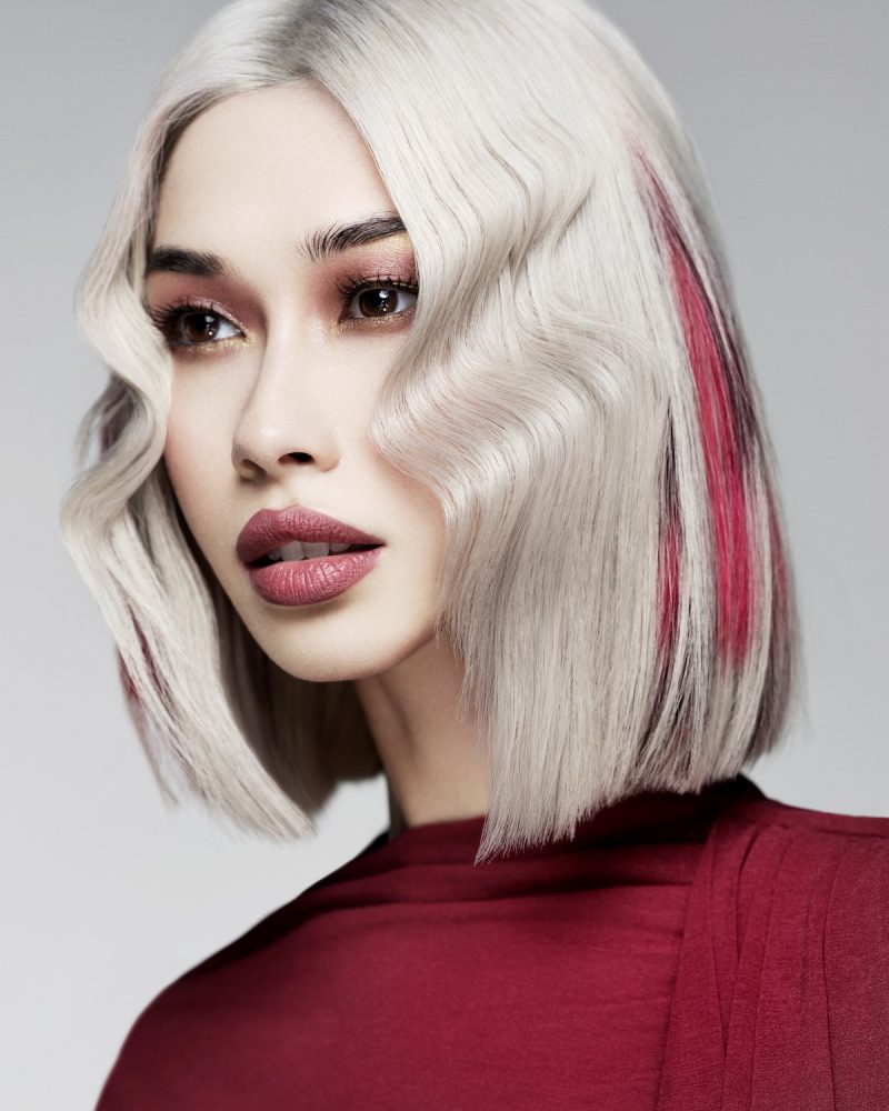 Brian kept the colour controlled, and somewhat minimal so as to complement the shape rather than overpower it. He tells us: “The hair was lifted to a clear, cool platinum to reflect the brightness of Maltese light, then toned to a soft neutral finish. Through the interior, I added subtle panels of rose and carmine to create hidden warmth. They’re not immediately visible but come through when the hair moves, giving the look a bit more dimension and interest.