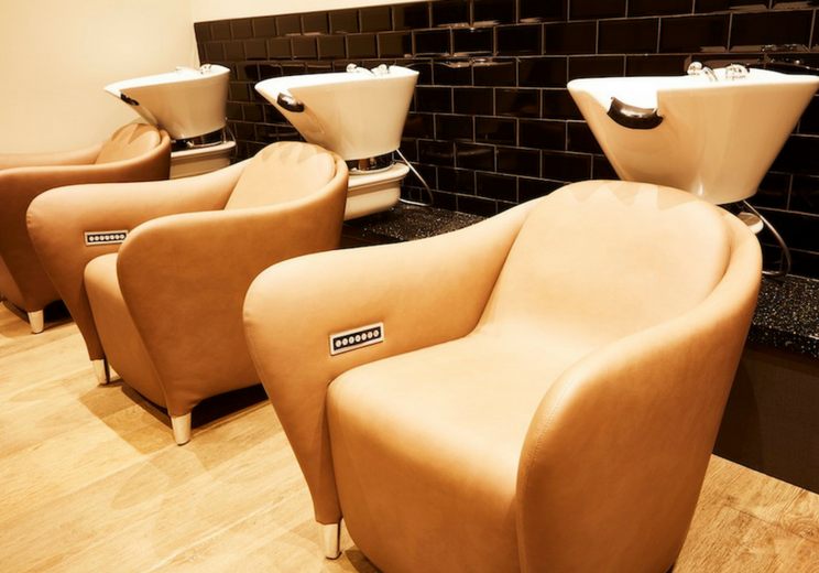 Luxury reclining massage chairs at the backwash are also arranged so that the backbar is moved to become shelving in-front of the client, meaning they can see exactly what products are being used on their hair. Neat! Bespoke, minimalist styling stations are matt black/flecked gold and silver Corian styling stations include concealed cupboards and don’t allow for clutter.