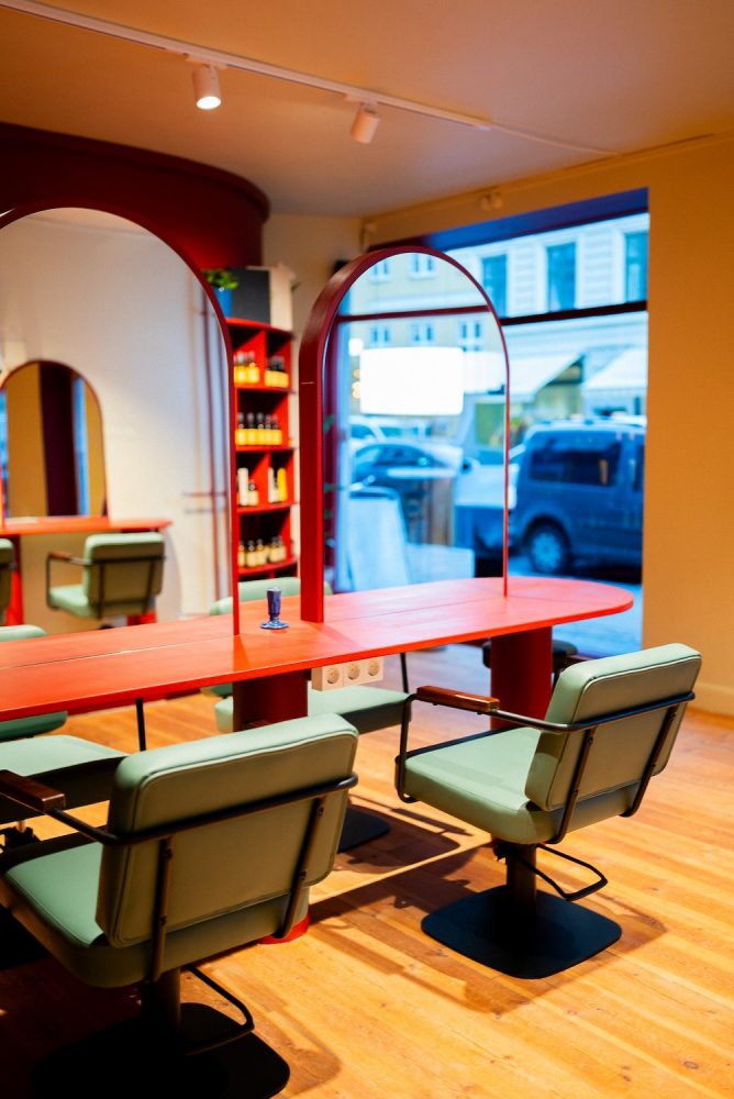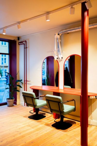 In the backwash room, original metal-plated walls are softened with light-blue hues and warm lighting. It conspire to create a calming retreat for clients during treatments. A palette of deep greens, dark terracotta and flashes of red ricochet throughout, resulting in an interior that feels playful, expressive and cosy.